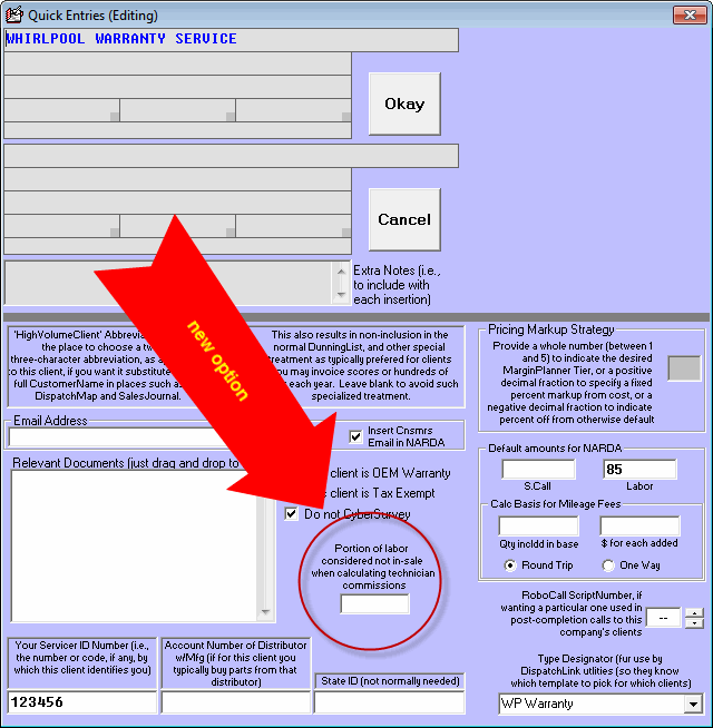 There is major manufacturer (okay, it's Whirlpool) that pays an added amount on warranty claims to compensate for parts handling. In ServiceDesk sales accounting, users typically add this amount into the labor column. Of course, it's not actually labor, and, if you pay your technicians a commission on labor, it's possible you'd rather not pay them a commission on these added amounts. That's what this new feature is for: