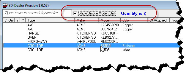 What this does is, instead of showing a separate line-item for each of your items in inventory (which means, if you have ten of Model XYZ, there will be ten line-items of Model XYZ), it changes to show only one line-item for each unique model number. Additionally, as you move mouse pointer over each item, a notation in that bar at top will indicate the quantity of that model you have in stock.