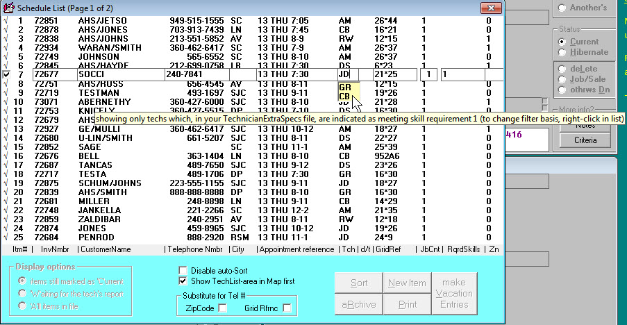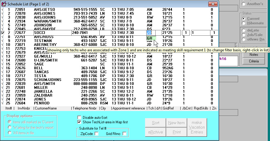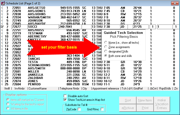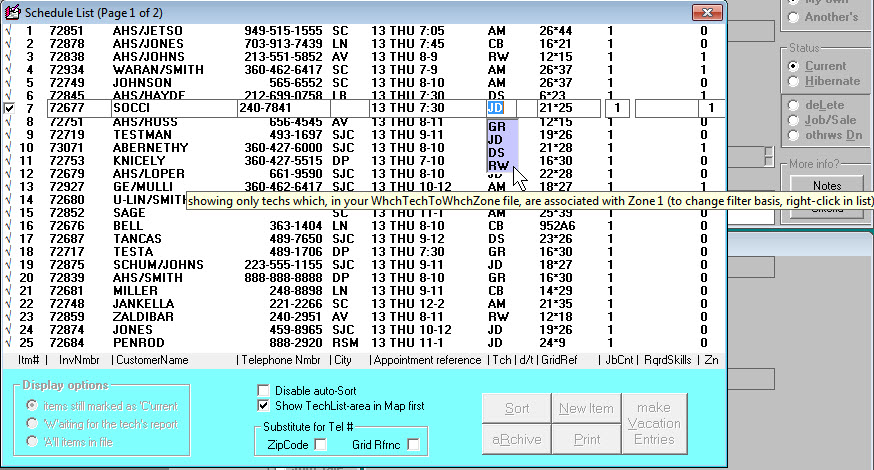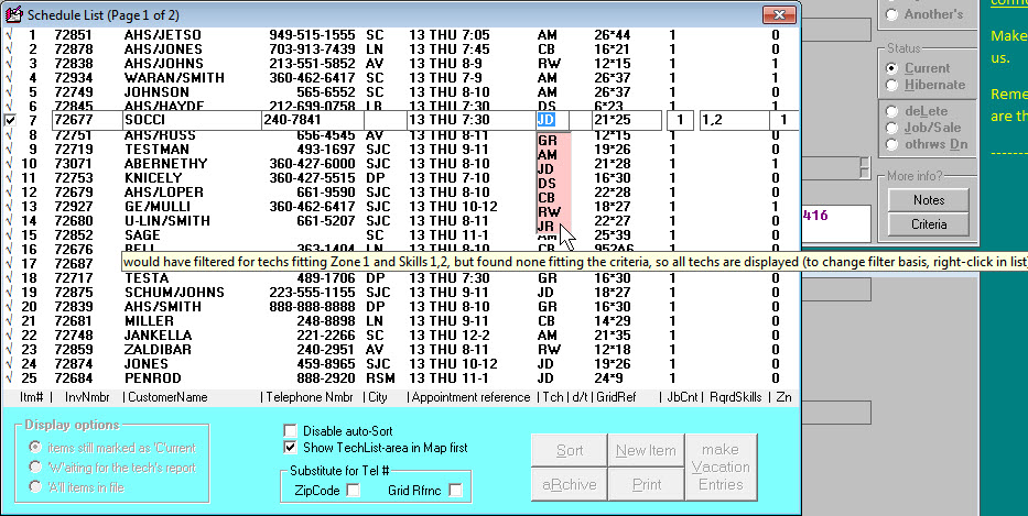 Like its infant beginning, our mature animal will also draw information from a file you create (if desired) that describes which techs you wish to have working in which zones (again, see here). However, unlike the earlier offering, it will include use of that information to filter tech selections in the other two contexts that make sense (again, the DispatchMap and ScheduleList interfaces).