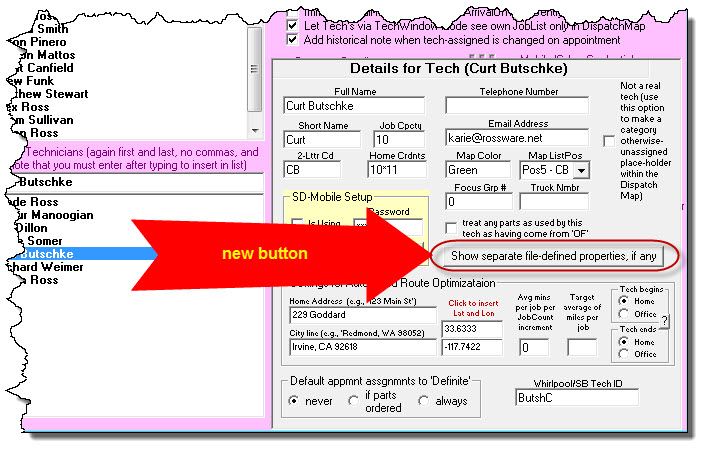 It only makes sense that, in the same place where otherwise setting (or reviewing) properties for a particular tech, you should have ready access to see what properties have (if applicable) been separately file-specified for that same tech. So, there's a new button in the Technician Properties window (appears in the Settings form after you click on tech's name in the TechRoster):
