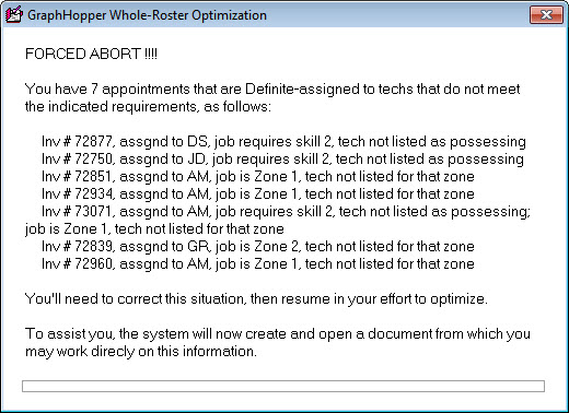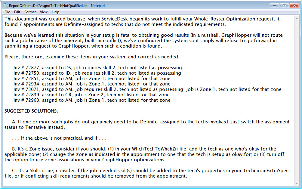 We're not referring here to imperfections in how ServiceDesk assembles "the problem" for presentation of for GraphHopper (though indeed there have been imperfections in that that we've discovered and fixed along the way); rather, we're referring to imperfections in a how a user's jobs, appointments and technicians are setup, vis-a-vis the problem -- in a manner that, essentially, makes any programmatic solution of the problem logically incoherent.