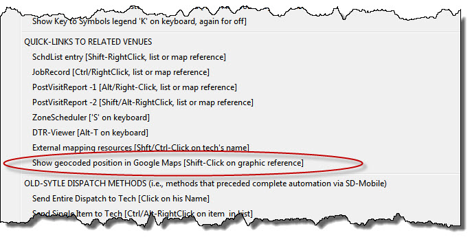 Our new tool is called "Show Geocoded Position." To use it, do a Shift+Click on any graphic appointment reference. ServiceDesk will immediately open a Window in Google Maps, showing that Lat/Lon location as pulled from ExtraNotes in the underlying JobRecord. You can quickly zoom out, and see if the geographic position as shown there at least approximates the same as shown in your DispatchMap. If the two do not agree, you've found the explanation, and may then work for fix it.