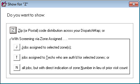 The third option will similarly screen, but instead of screening by which jobs are assigned to the zone (or zones) you select, it will instead screen for the tech's indicated as available to work in such zones (as a refresher, such indications are done via your WhchTechToWhchZone file, see here for details).