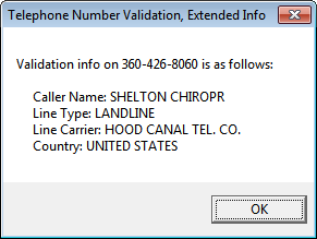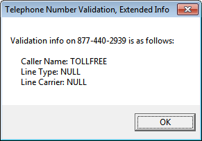 So now, if you manually invoke an ad hoc request for a telephone number validation (just do a Ctrl-Click on a telephone number in a JobRecord or Callsheet; a ToolTip will guide if you float your mouse pointer over a telephone number box), the system will provide you with available added information: