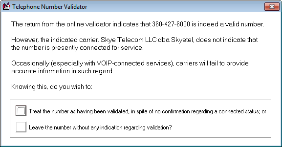 When doing this work, we incidentally discovered that in some instances a number can be valid and connected, yet the applicable carrier has not reported it back to the general system as being connected. So, we added an enhancement to better deal with that circumstance: