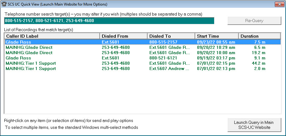 How it works is simple. Just click on a new button that's next to one or more telephone numbers of interest. Assuming you have a SCS UC account and have provided your account credentials to SD, SD does an immediate check on all the telephone numbers in the row adjacent to where you clicked. Almost instantly, you'll see a list of relevant recordings: