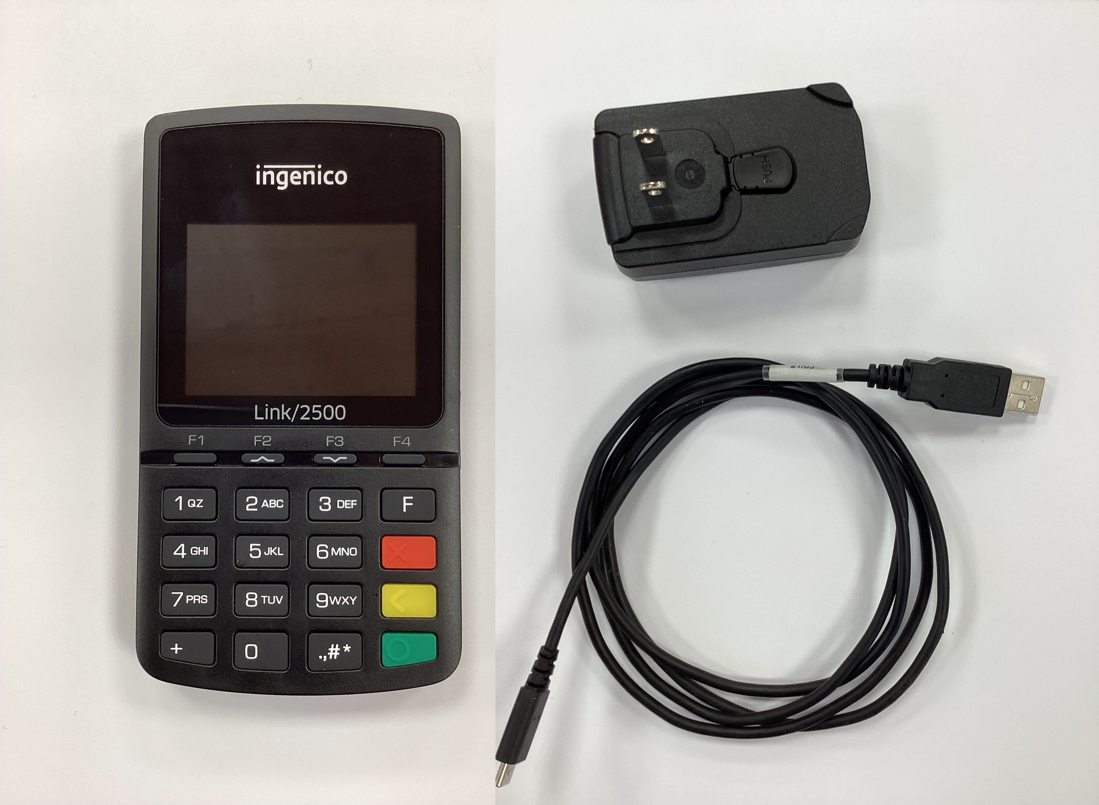 The Ingenico Link/2500 does not need to be plugged into a power source to run as long as it has a charged battery. It can be charged using the included cable via any device with a powered USB-A port (such as a desktop computer, laptop, or battery bank), or with the included USB to wall power adapter.