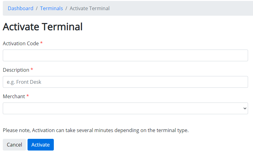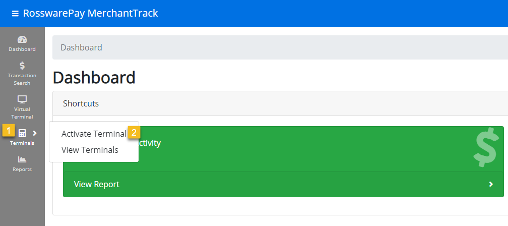 Navigate to your MerchantTrack account page. And click on the Terminals > Activate Terminal option on the left menu. This is where you will enter your activation code provided by the card reader.