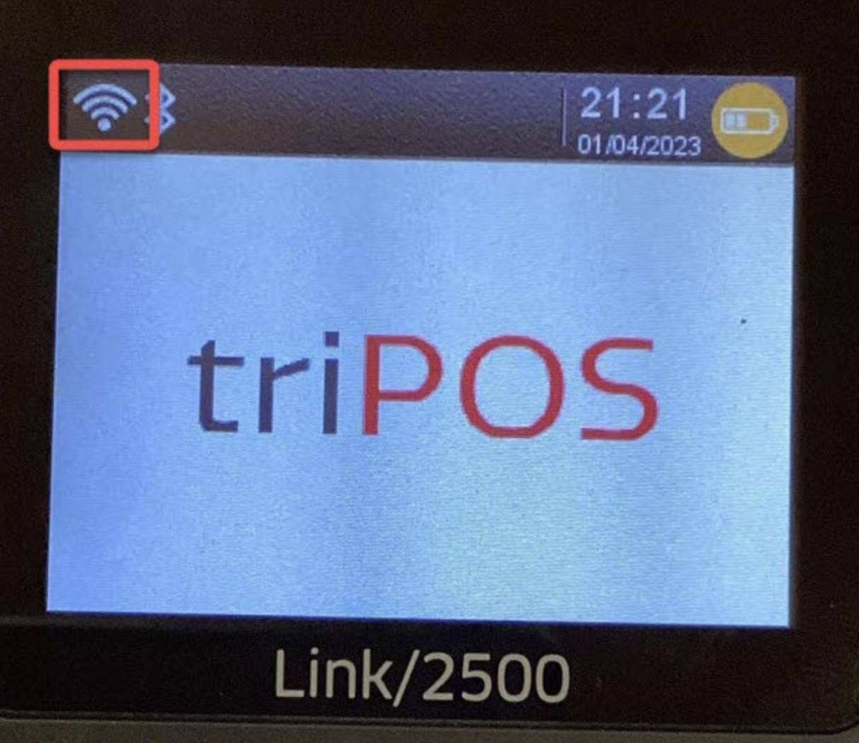 The screen will display the triPOS logo once it is initialized. The WiFi symbol will be white, this indicates the card reader is offline: