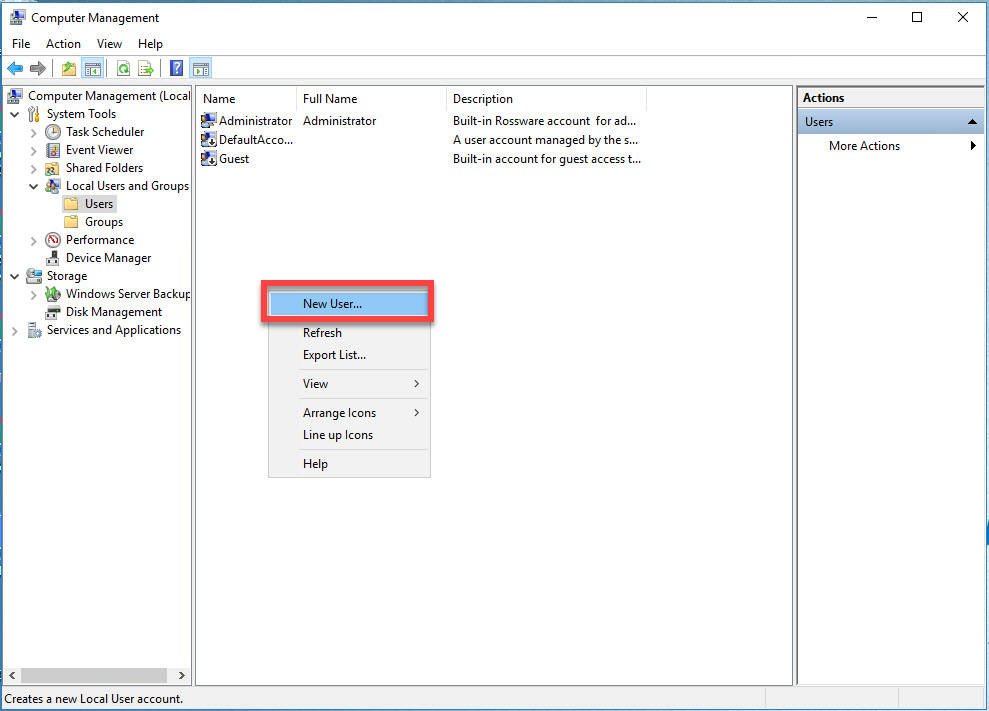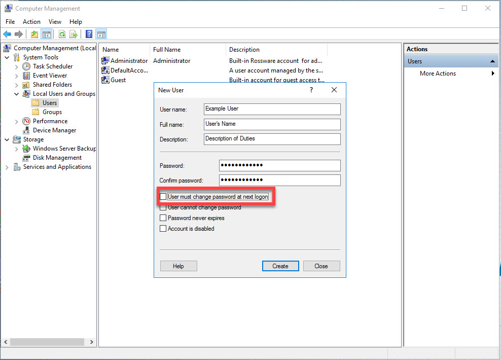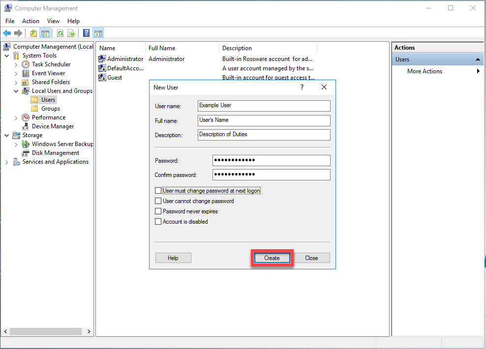 Once the desired information is filled in, you can proceed by clicking the "Create" button. Please note that the New User window will stay open so you can create more users if needed. If not, go ahead and close the New User window and exit the Computer Management program.