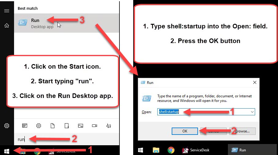Either hold the Windows key and press R, or search for Run from the search bar. When the Run dialogue box opens type shell:startup and click the OK button.
