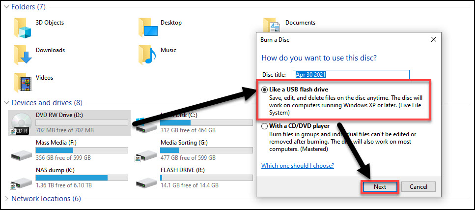 First, the CD or DVD will need to be formatted to be used as a flash drive rather than a standard writable disc. Once you have inserted the disc into your disc drive, open file explorer. Double click on the disc drive (under Devices and drives) and verify that Like a USB flash drive is selected, and then click Next. The disc drive will then format the CD or DVD accordingly.
