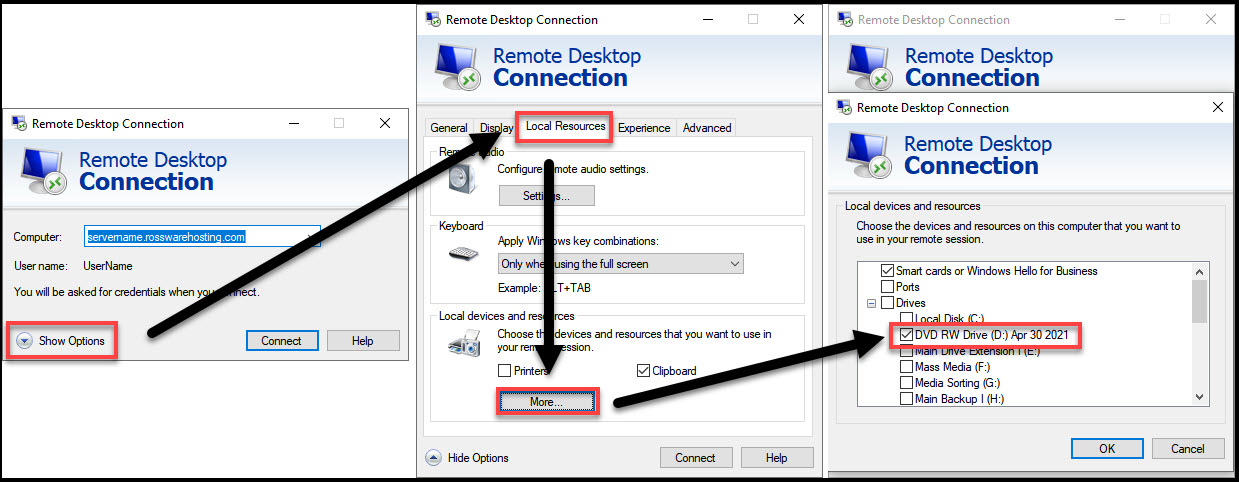 Once the CD or DVD drive has been formatted to be used as a flash drive, we will need to make it available to the RSS server. After opening the Remote Desktop Connection program, and before connecting, click on Show Options (bottom left). Then click on the Local Resources tab, then the More… button under Local devices and resources. When the Local devices and resources window opens, select the proper disc drive. (In most cases, this will be drive D:)