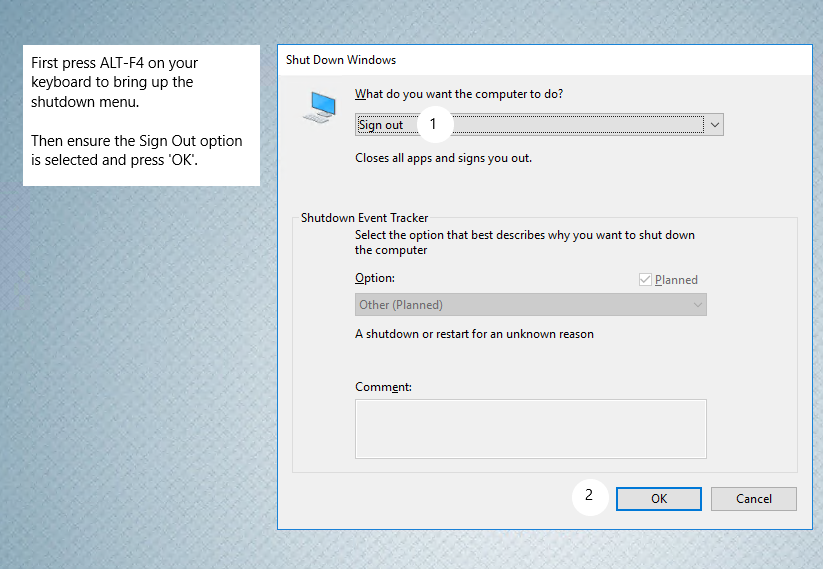 The second can be done by pressing Alt+F4 from your desktop (sometimes open applications can interfere with this keypress). This will bring up a dialogue. Simply make sure 'Sign out' is selected on the dropdown, then press 'OK'.