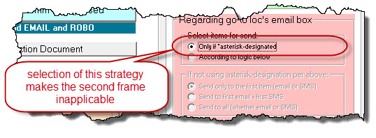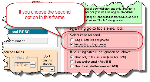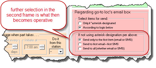 In regard to the RED-ISH section in this settings area (which governs email box treatment), the first little sub-frame invites you to pick: (a) a strategy whereby you place an asterisk next to any item in the email box that you want to have used as an auto-communication target (that's obviously the first radio button there);