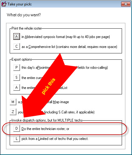 As a second manual method, you may initiate communication sends on all appointments for the selected day as pertain to a particular set of multiple technicians. Initiate this method same as the above (i.e., go first to the desired day's display in the DispatchMap, then hit Alt-P on your keyboard). But, in this case, choose this option in the dialog box: