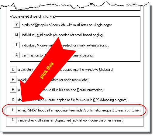 As a first manual method, you may initiate communication sends on all applicable appointments as pertain to a selected day (typically tomorrow). To do this, go to that day's display in the DispatchMap, and hit Alt-P on your keyboard. That brings up a menu of options regarding multiple things you may with a day's roster of appointments, including this one: