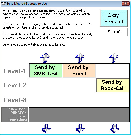 Thus, with the arrangement set as per above, the system would send a SMS if in an applicable JobRecord a SMS target is found (according to such scheme as you've defined and according to such textual arrangement as is in the JobRecord, see here). It would also send a email if similarly finding a suitable email target. If it found either, it not not proceed to the next level. If, however, it found neither, it would then proceed in seeing if the JobRecord (along with the logic of the scheme you selected) offered a RoboCall target. If so, it would then send via RoboCall.