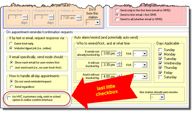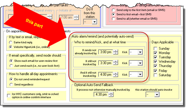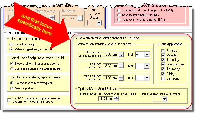 . . . is what you might think of as an emergency fallback. Suppose that by a certain time in the day no one in the operation has initiated sends of appointment-reminder/confirmation requests (i.e., no one has responded to any "kick"). Positively, you don't wan to fail in getting those "sends" out. At this point in day, with no human having done it, there is risk it won't happen at all. Here, in this section, you can set a time of day by which, if the sending process has not already been manually initiated, ServiceDesk will itself auto-initiate, on its own. This assures it gets done, one way or the other.