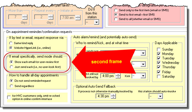 This third frame deals with the question of whether you want appointment-reminder/confirmation-requests to go out on appointments that have not been narrowed to a smaller time-frame than all-day: