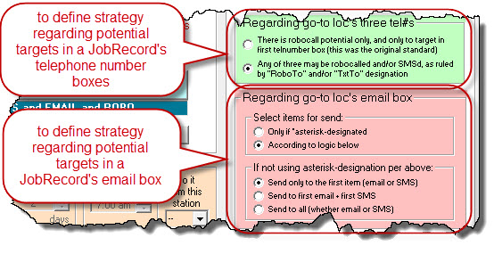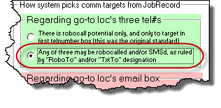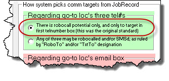 In regard the GREEN section (which governs telephone-number-box treatment), our long-ago and original strategy was that whatever such telephone number as is placed in the first of the three telephone number boxes is considered a potential RoboCall target (none of the boxes were considered candidates for text messaging, in part, because that's an offering that came later). This scheme continues as the first option. Thus, if you pick that first radio button in the GREEN section:
