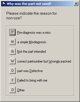 For background, a tech in SD-Mobile is presented with a list of items that have been prior ordered on a job or speculatively assigned to it (aka items from the job's applicable PartsPickList). With respect to each, he must indicate either that it was used on the job, or the reason for non-use. This latter indication is done via his selection from a list, as to potential reasons. SD-Mobile has a default list that will likely suffice for most companies:
